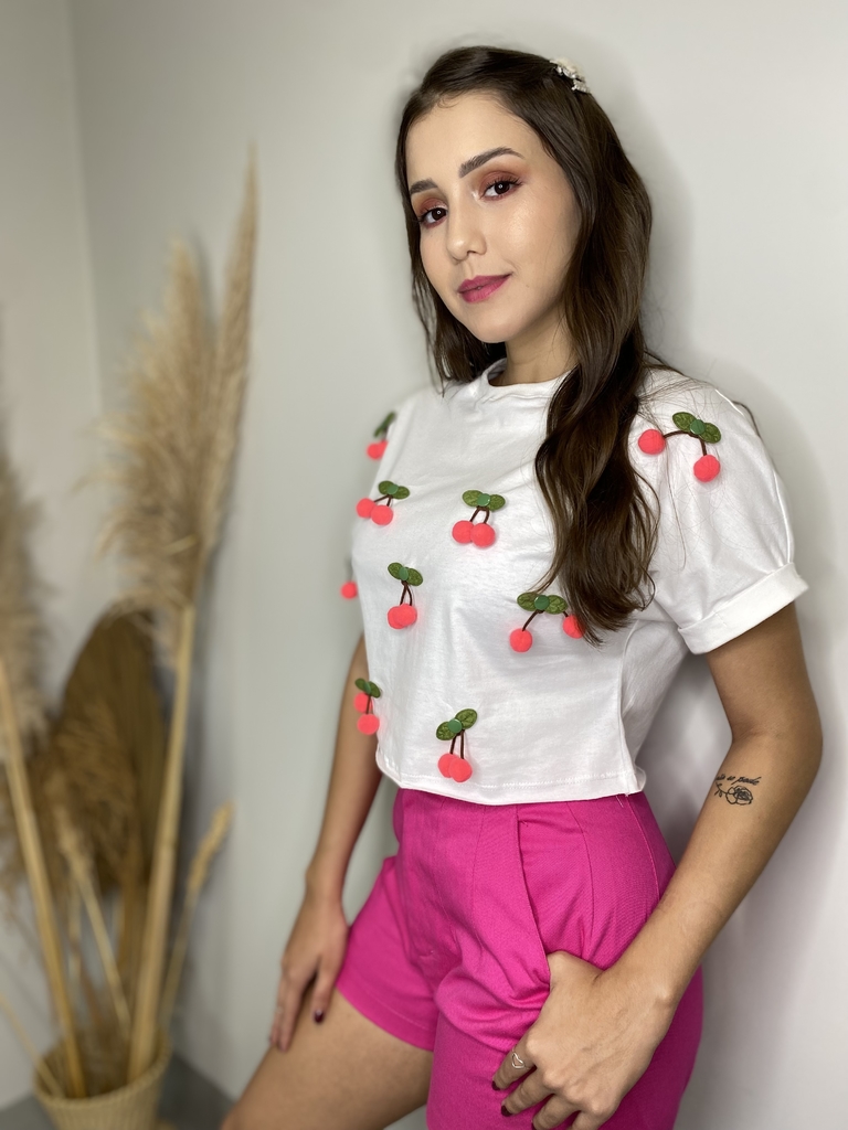 Tee desenvolvida pela Juliana Almeida, estilo cropped, manga estilo asa de morcego com acabamento em dobras e barra sem costura, cerejas em pompom removíveis para lavagem da peça.